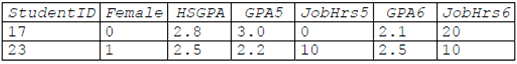 Untuk perbandingan, dimulai dengan dua model regresi linier OLS konvensional, masing-masing untuk setiap periode. Catat bahwa variable female highgpa (HS GPA) invarian dalam waktu (time-invariant).